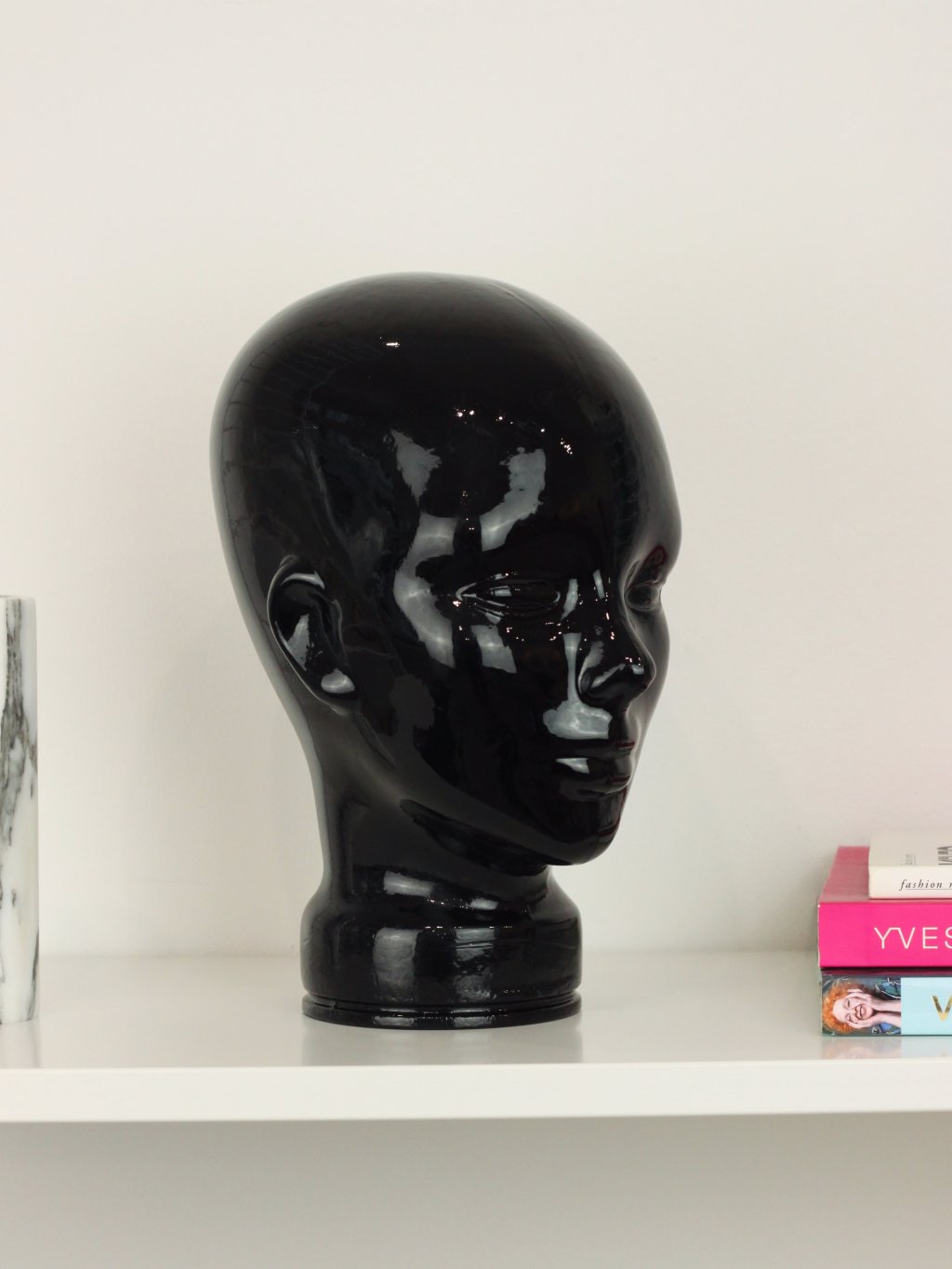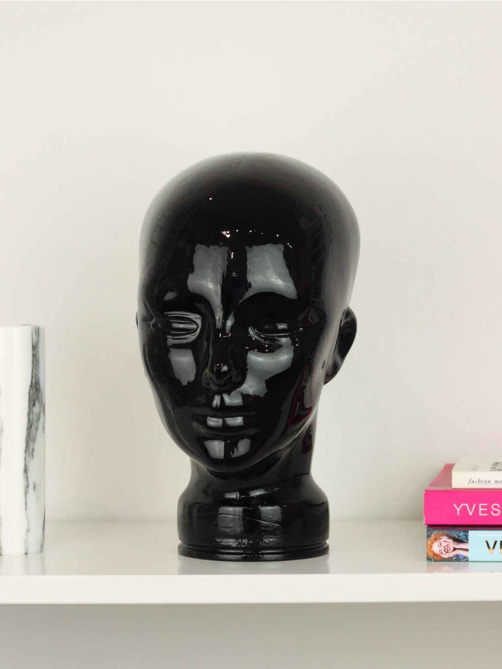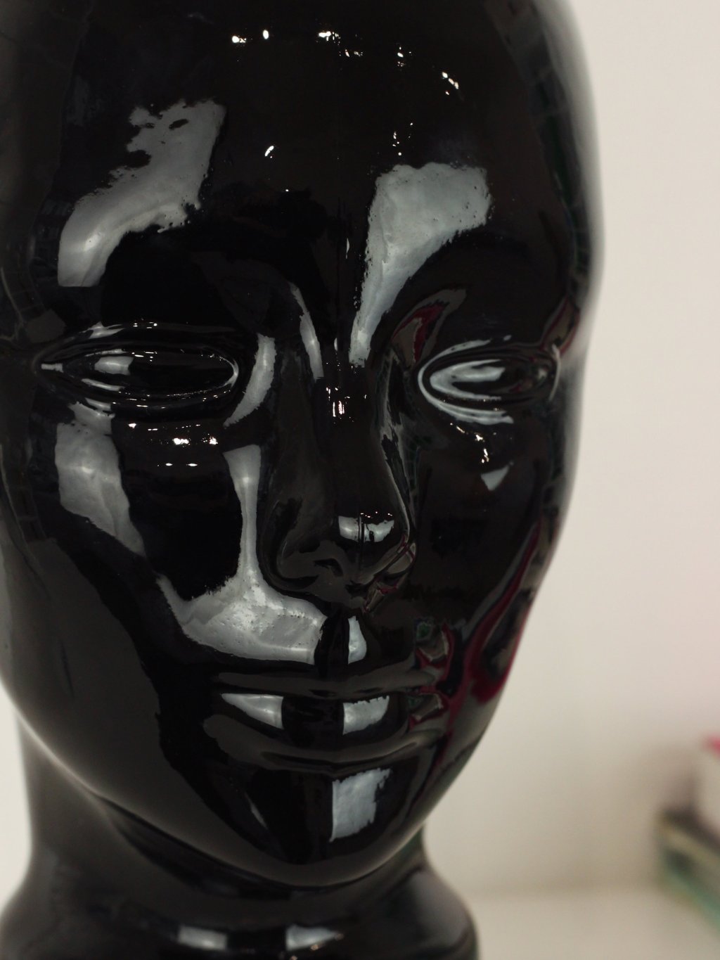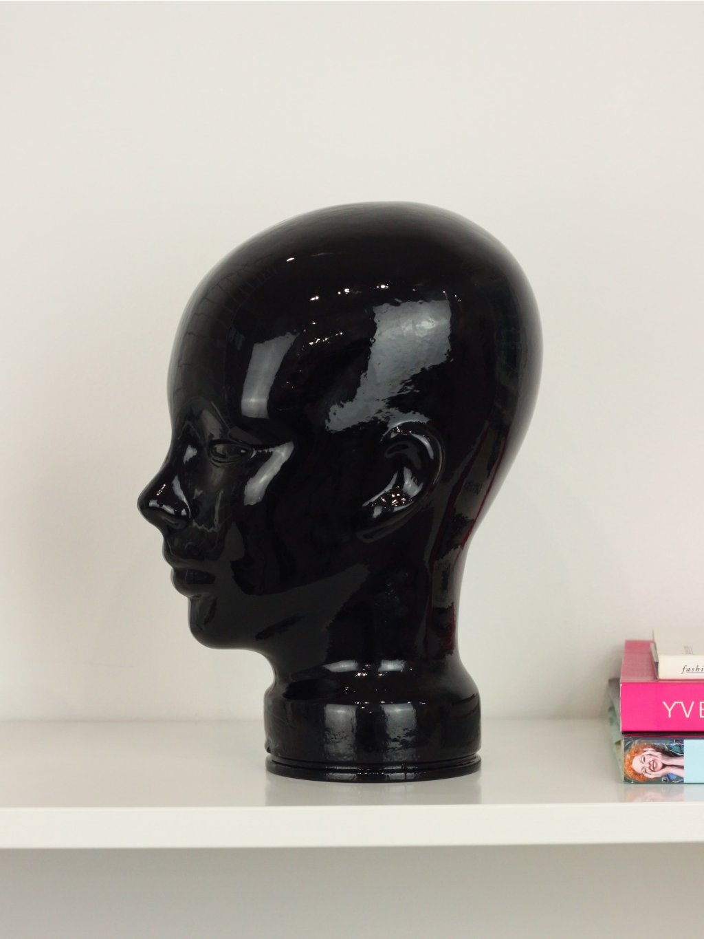 Skleněná hlava ze 70.-80. let, která se používala na vystavování klobouků a paruk