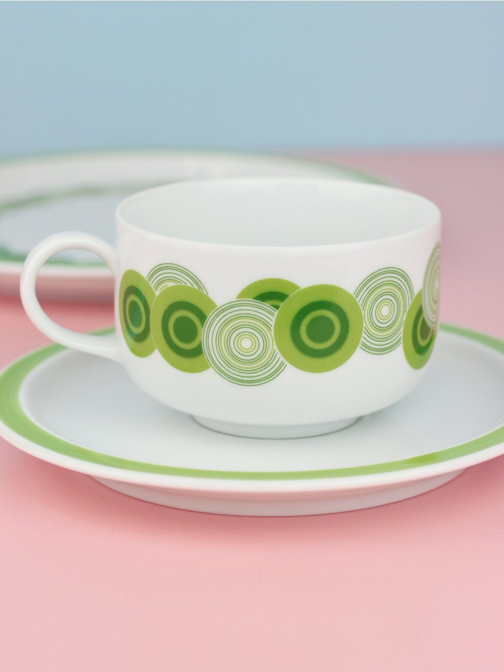 Breakfast set (cup + saucer + dessert plate) with an interesting 70s decor from the German porcelain manufacturer Melitta