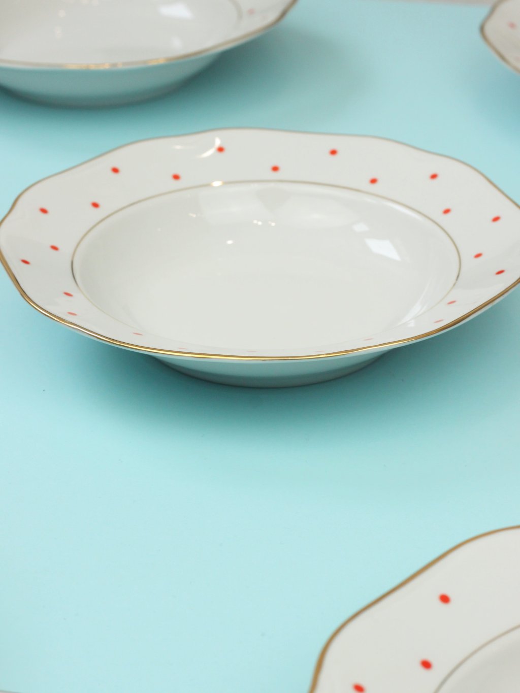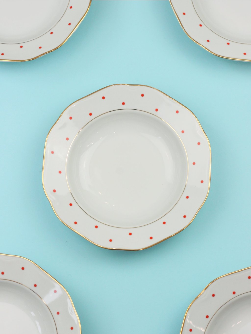 Deep plate with timeless red polka dots and gold lines from the Czechoslovakian porcelain factory Bohemia Nová Role