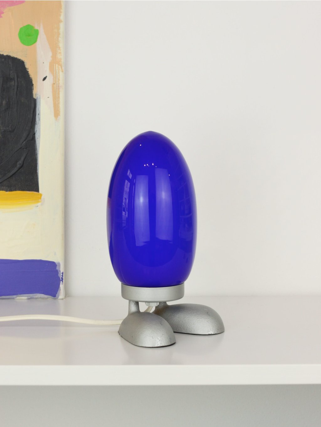 Funky Fjorton lamp nicknamed "Dino Egg"designed by Japanese designer Tatsuo Konno for IKEA, was sold between 2000 and 2002. It consists of hand-blown layered glass and heavy metal legs.