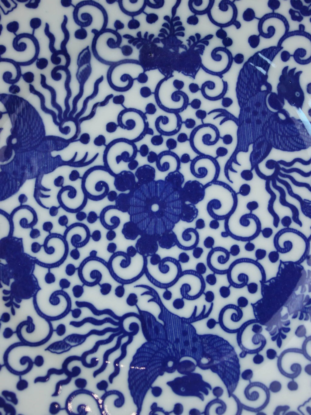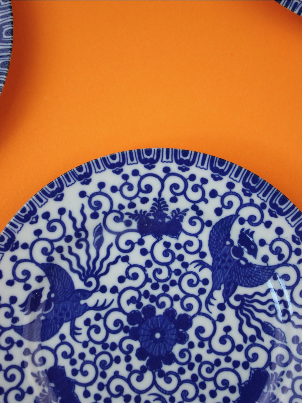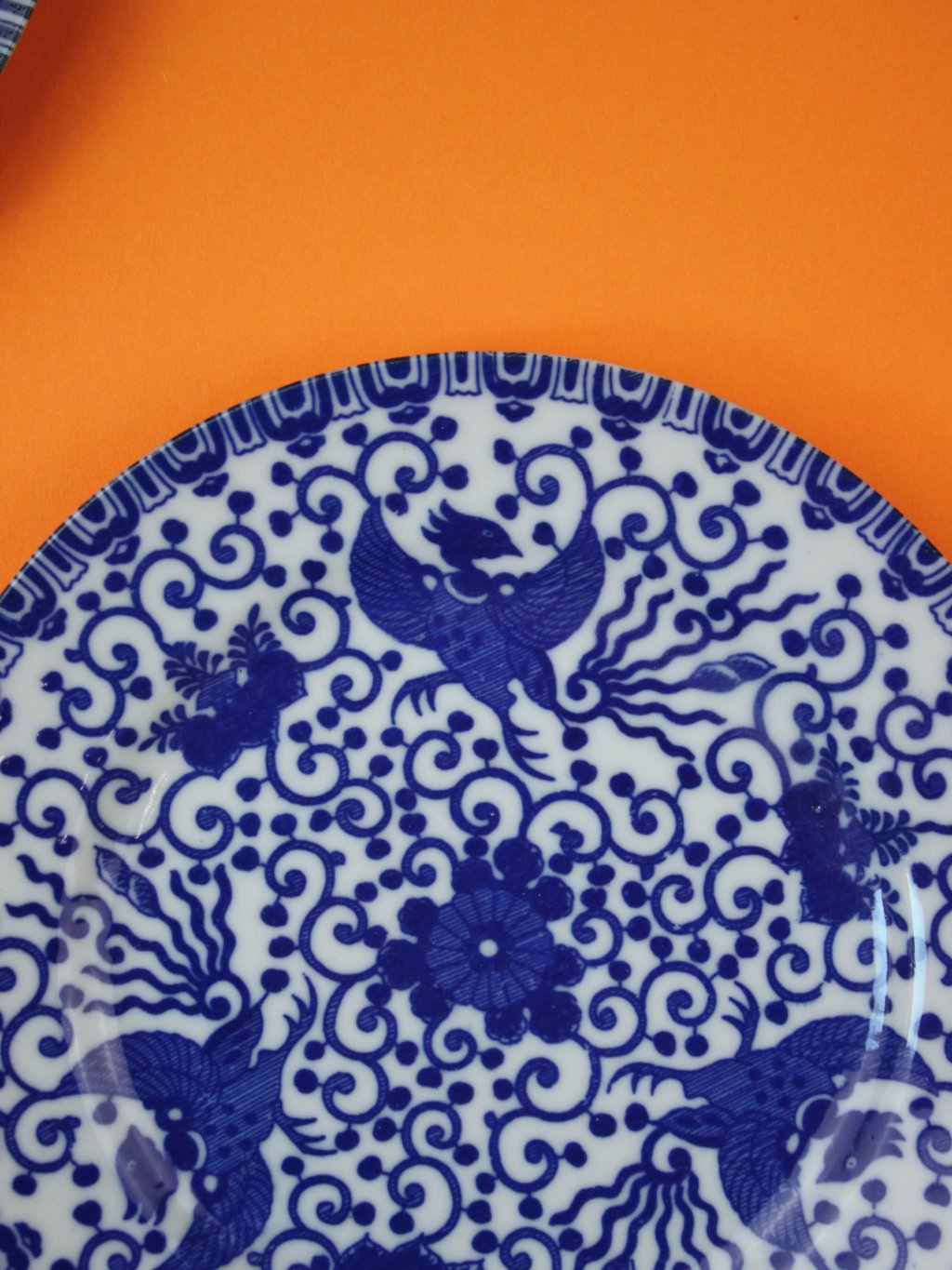 Japanese dessert plate with a mythical phoenix motif decorated with traditional transfer printing