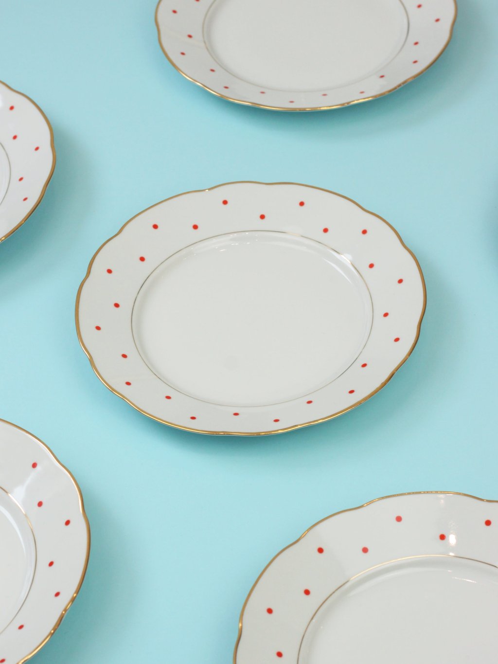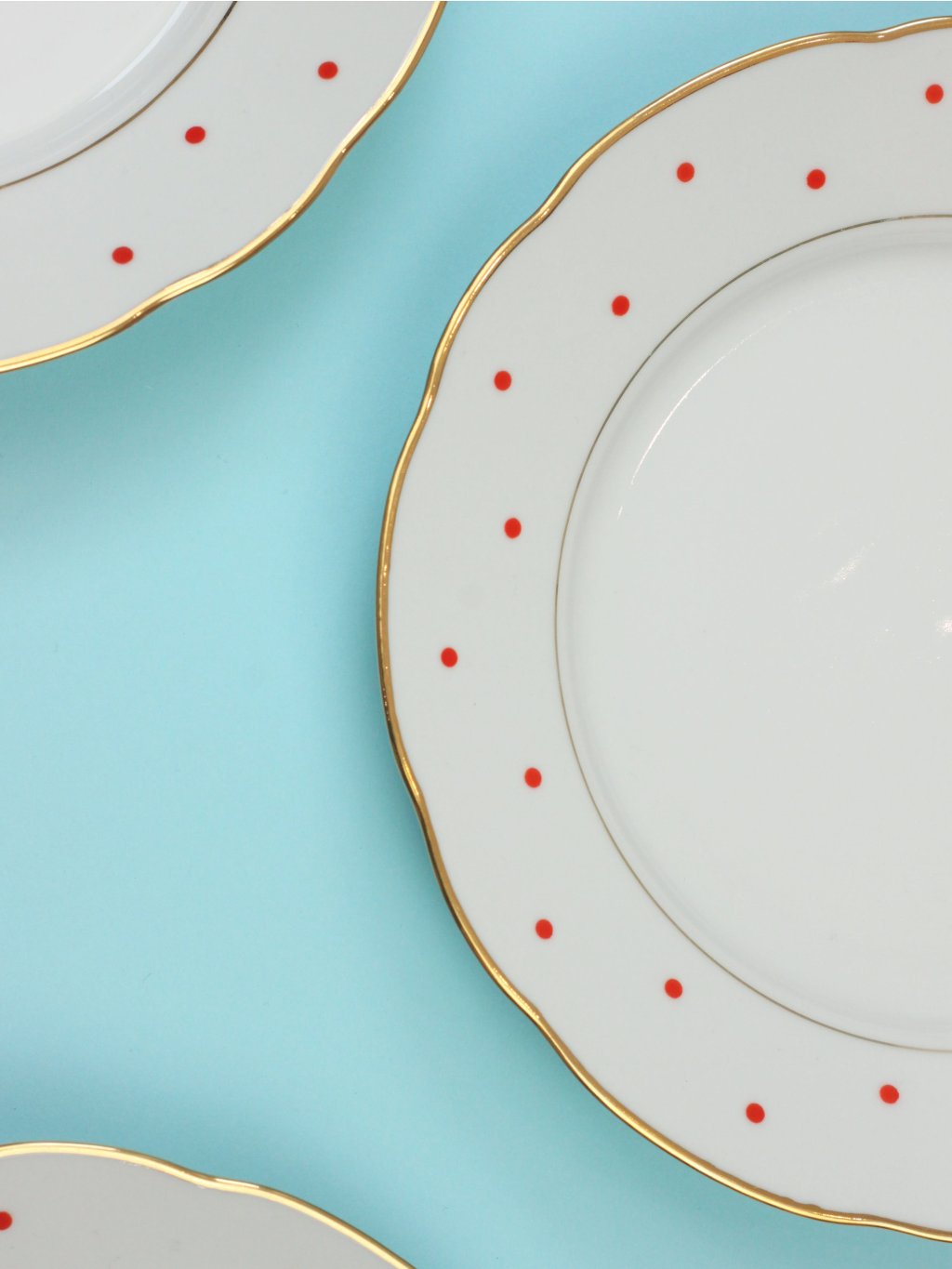 Jídelní talíř s nadčasovými červenými puntíky a zlatými linkami z československé porcelánky Bohemia Nová Role