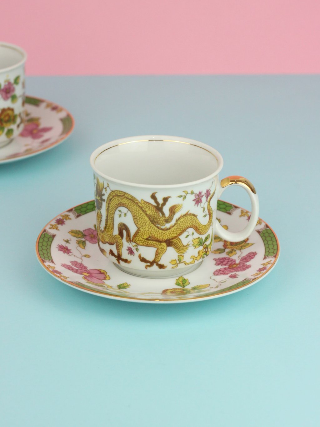 Šálek s podšálkem s motivem draka a sakur z československé porcelánky Loučky
