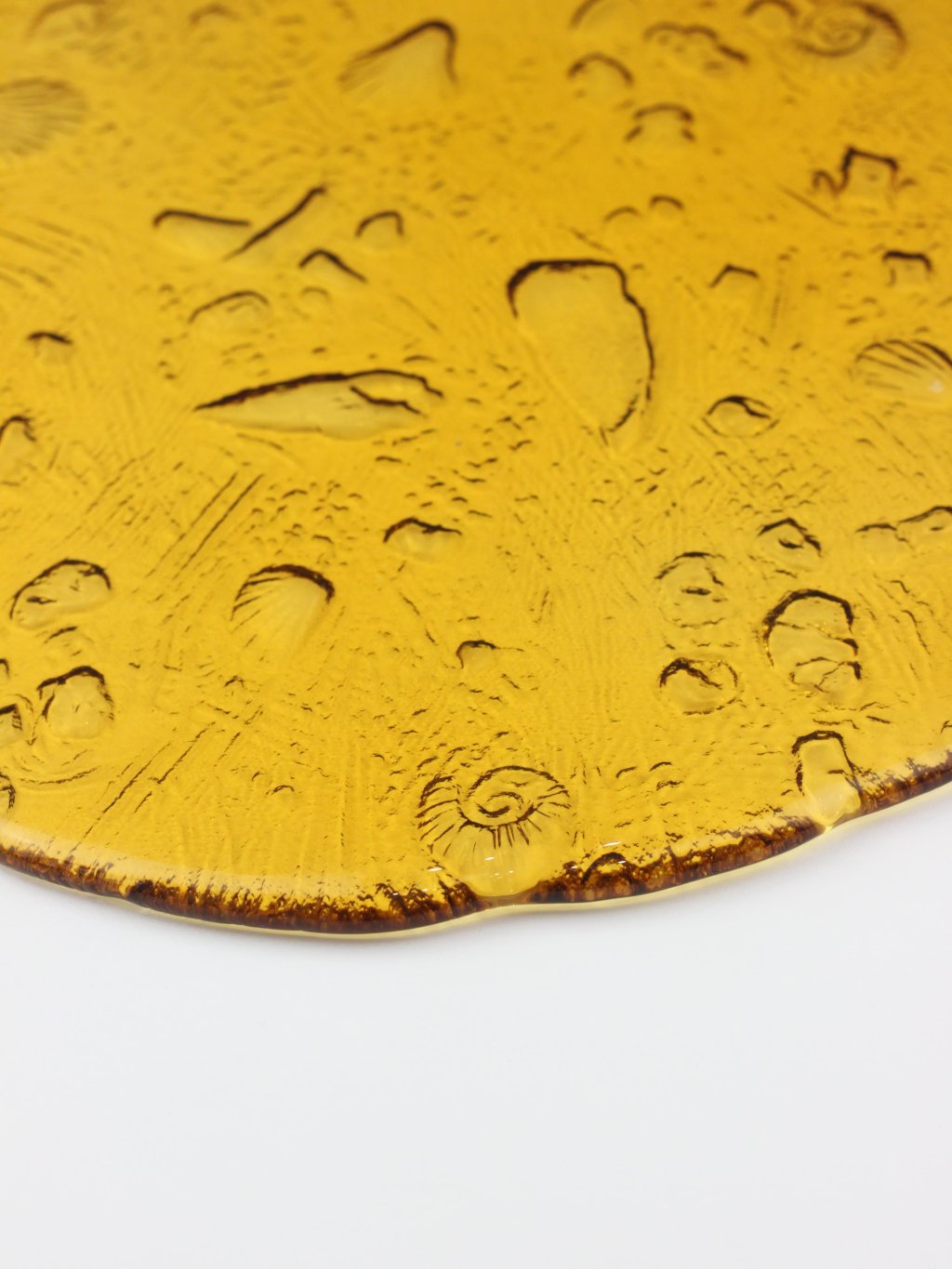 Mořský plochý tác s vystouplými madly z lisovaného ambrového skla dle návrhu Jiřího Brabce ze 70. let pro sklárnu Rosice